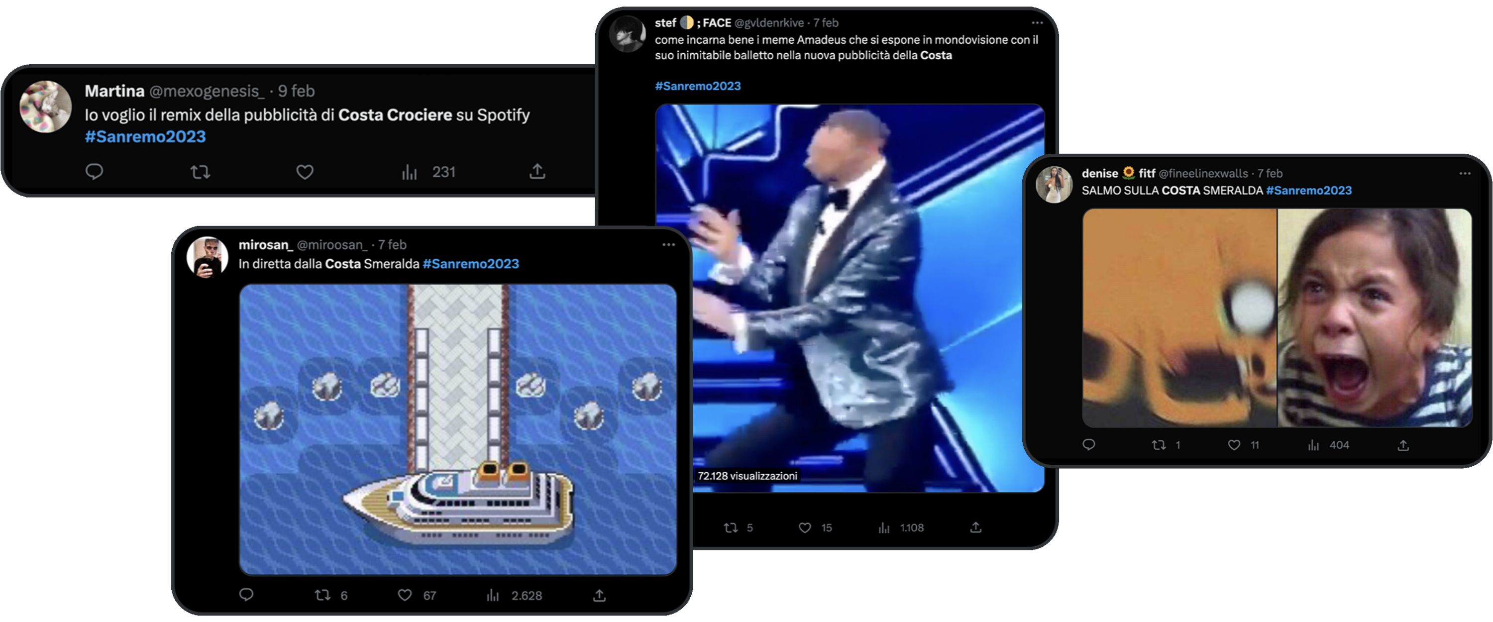The new song went around the world by itself: how many times do we find ourselves humming a song we have just heard? During the Sanremo Festival, this is a very recurring situation. Costa turned all these little performances into a collective show featuring passengers from all over the world.