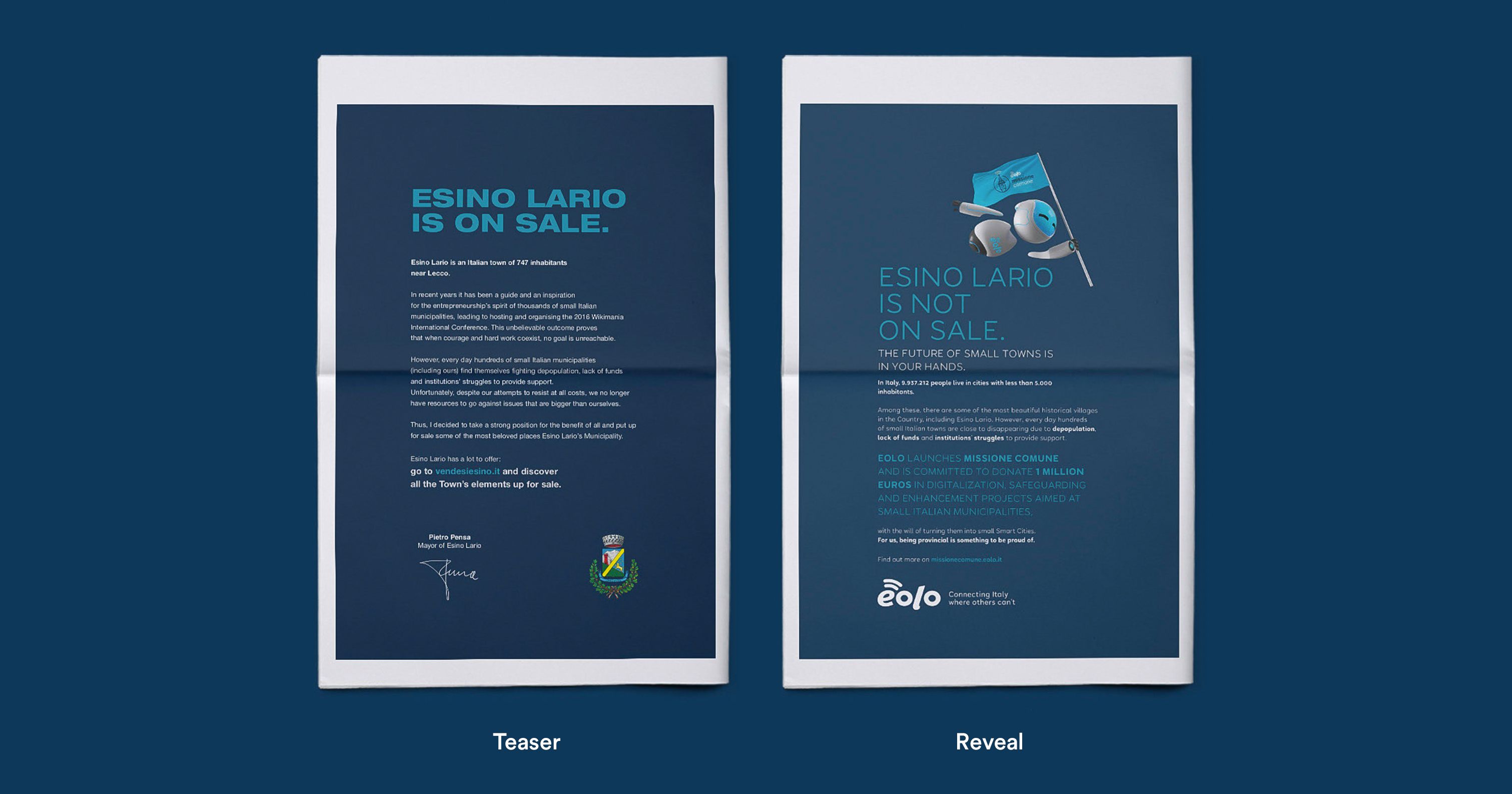 In Italy, millions of people live in cities with less than 5,000 inhabitants. Nevertheless, these towns are dramatically depopulating. This is why EOLO, an Italian local internet provider, decided to donate 1 million euros every year to support Italy’s smallest cities. But to bring this story to the public, first we had to turn the spotlight on the real issue behind our solution: in partnership with the small town of Esino Lario, we launched a shocking provocation about depopulation. We put Esino Lario on sale.